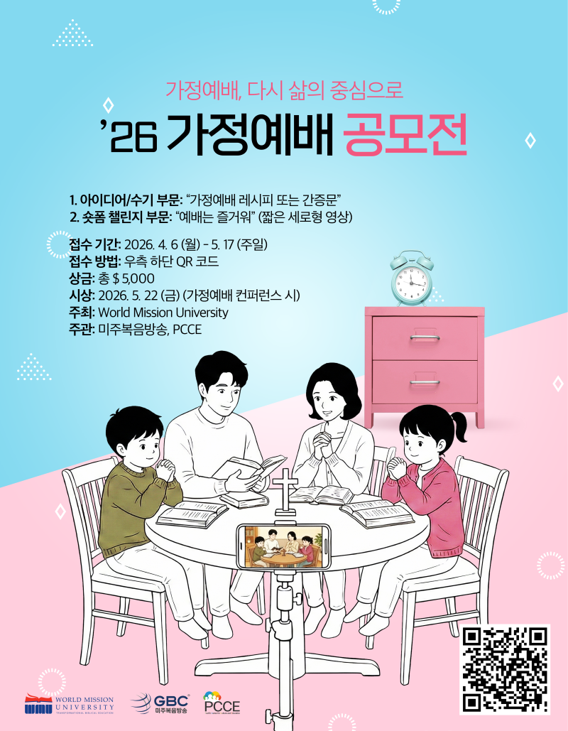 - 월드미션대학교 주최, 복음방송과 PCCE 주관으로, ‘2026 가정예배 공모전’ 개최… 총상금 5,000달러 규모