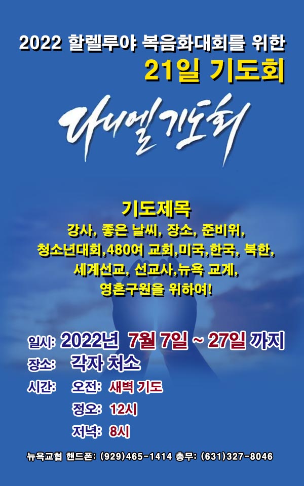 제48회기 뉴욕교협(회장 김희복 목사)은 2022 할렐루야 뉴욕복음화대회을 21일 앞둔 7월 7일부터 27일까지 21일 동안 각자의 처소에서, 새벽에 한 번, 정오에 한 번, 오후 8시에 한번 등 하루 3번 씩 '2022 할렐루야 뉴욕복음화대회를 위하여' 아래의 기도 제목들을 위하여 기도해 줄 것을 회원 교회들과 성도들에게 부탁했다.