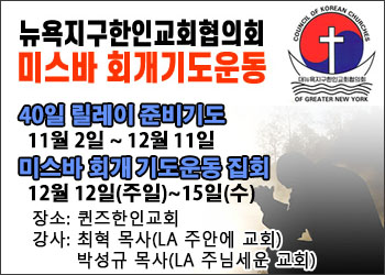 뉴욕교협(회장 김희복 목사)은 12월 12일(주일)부터 15일(수)까지 나흘 동안 미스바 회개 기도 운동 집회를 갖는다.