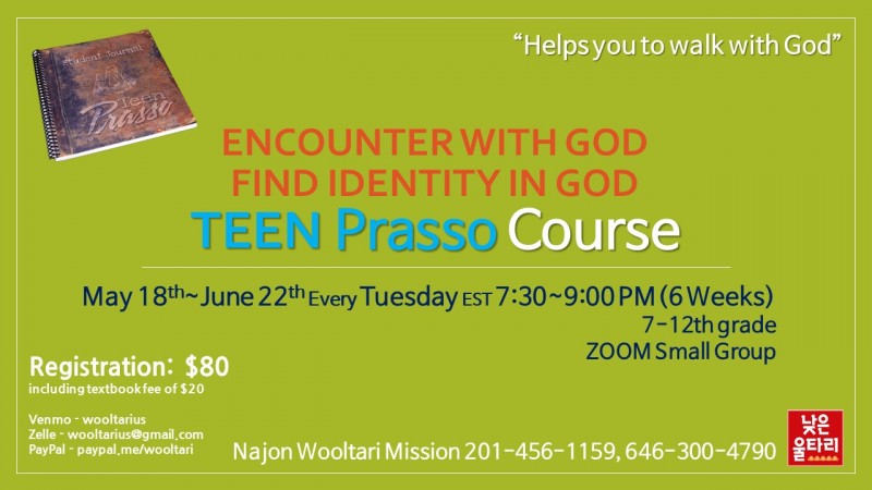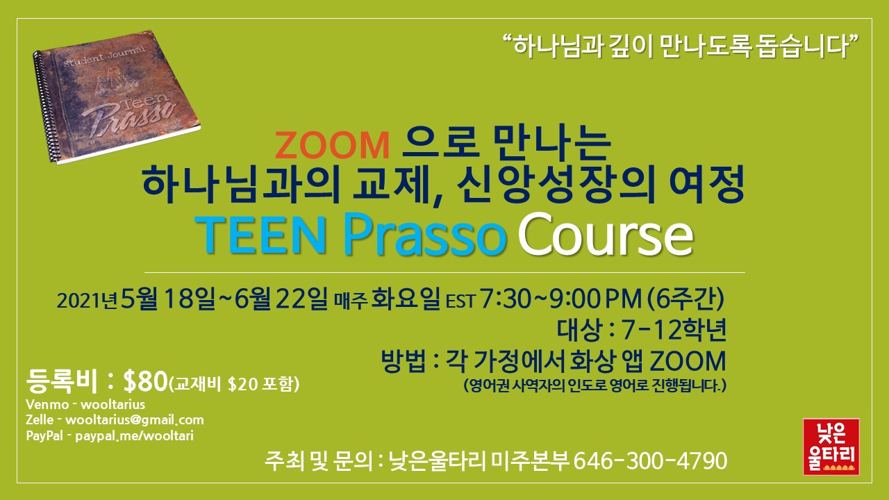 낮은울타리 미주본부(대표 : 조희창 목사)에서 뜨거운 반응가운데 진행되어온 Teenager 자녀들을 위한 <Zoom으로 만나는 Teen Prasso Course>3기를 개강합니다.