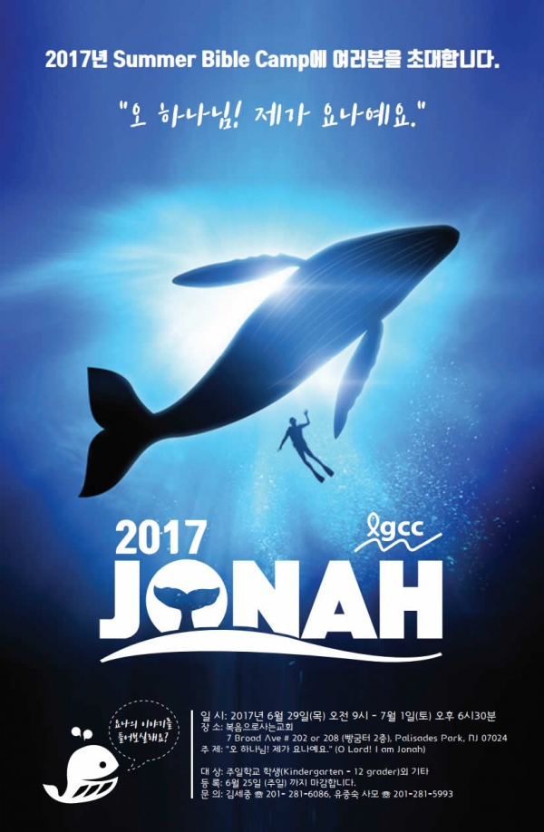 1. 일시 : 2017년 6월 29일(목) 오전 9시 - 7월 1일(토) 오후 6시30분 2. 장소 : 복음으로사는교회 7 Broad Ave # 208 (빵굼터 2층), Palisades Park, NJ 07650 3. 주제 : "오 하나님! 제가 요나예요." (O Lord! I am Jonah) 4. 대상: 주일학교 학생(Kindergarten - 12 grader)외 기타 5. 회비: 내부 학생 $70 (교재비․식대․간식․티셔츠, Six Flag 입장료, 선물 등 기타)/ 외부 학생 $90, 어른 $100 6. 등록방법: 첨부된 참가 신청서를 작성하시고, 회비와 함께 봉투에 넣으셔서 June 25th(주일)까지 복음로사는교회 주일학교 담당자에 제출해 주시기 바랍니다. 7. 등록마감: 6월 25일 (주일)까지 마감합니다. 8. 준비물: 여벌의 옷(수영복)․수건․편안한 복장 및 운동화․성경․필기도구 (연필 등) 9. 문의: 김세중 ☏ 201- 281-6086, 유중숙 사모 ☏ 201-281-5993