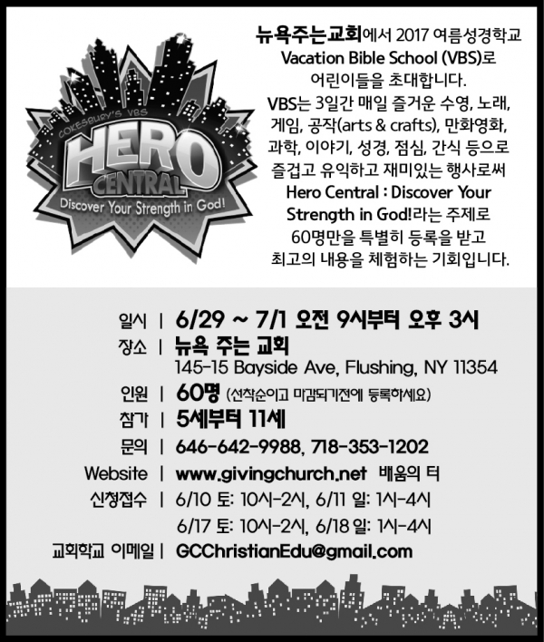 뉴욕주는교회 여름성경학교 안내 뉴욕주는교회에서 6월29일(목)부터 7월1일까지 여름성경학교를 개최합니다. 선착순 60명만 등록받습니다. 해외한인 장로회 뉴욕주는교회 145-15 Bayside Ave. Flushing, NY 11354 718)353-1202 www.givingchurch.net