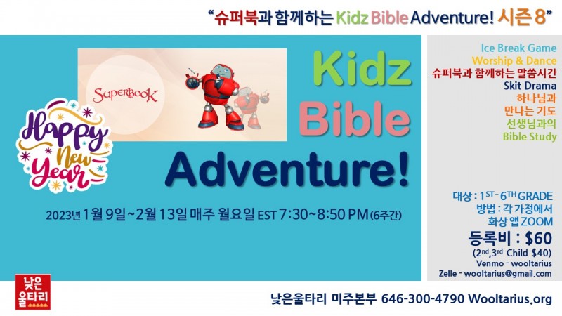 KIDZ BIBLE ADVENTURE 시즌8은 2023년 1월 9일 부터 2월 13일까지 매주 월요일 미주동부시간 7:30~8:50 PM 6주간 진행됩니다.