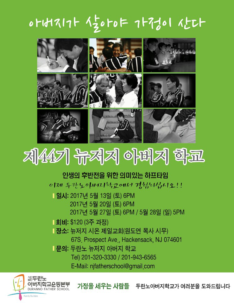 5월에 개강할 예정이었던 '제44기 뉴저지 아버지 학교'는 사정에 의하여 9월로 연기되었습니다.
