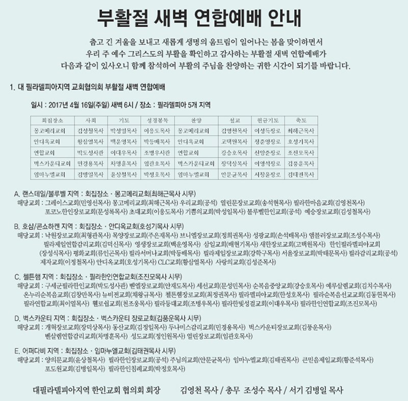 필라델피아 지역 부활절 새벽 연합예배 안내