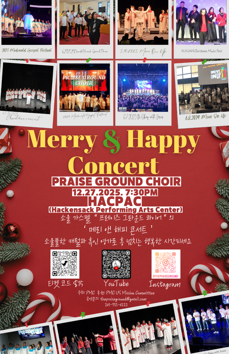 소울 가스펠 팀 ‘프레이즈 그라운드 콰이어(Praise Ground Choir)’가 연말을 맞아 크리스마스 콘서트 ‘Merry & Happy Concert’를 개최한다. 공연은 12월 27일(토) 오후 7시 30분에 Hackensack Performing Arts Center에서 진행된다.