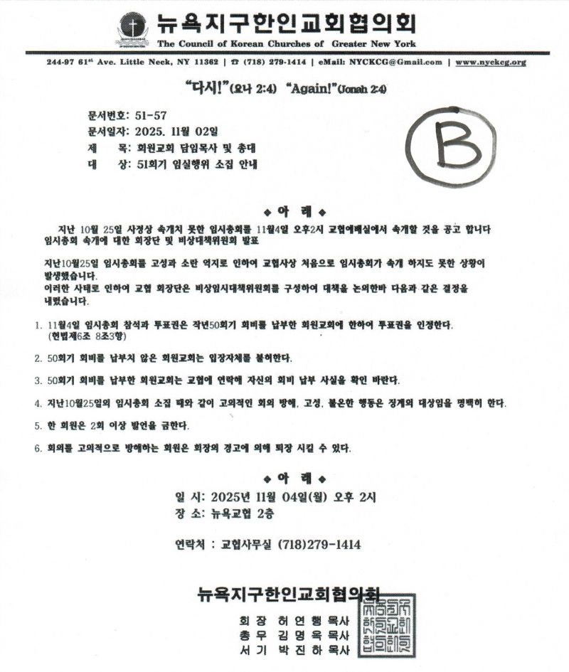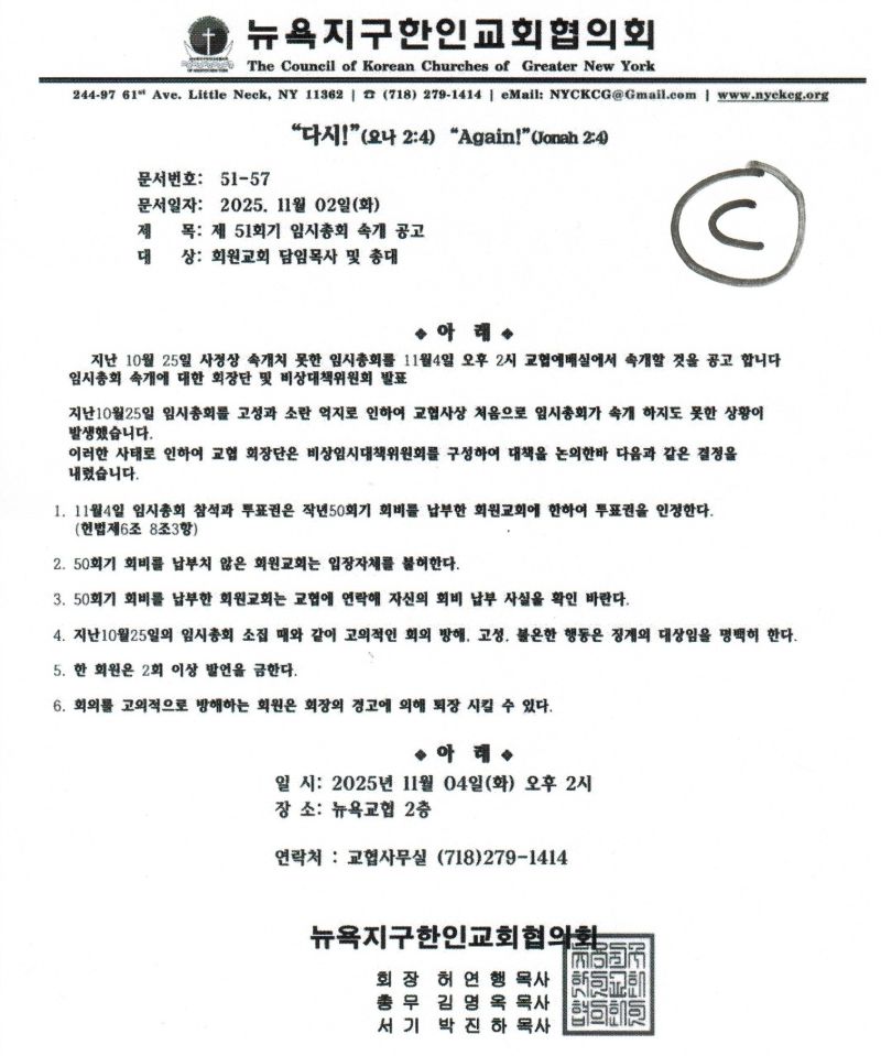 5. 뉴욕교협은 공문 Ⓒ의 제목에서 “제51회기 임시총회 속개 공고” 라는 표현을 썼습니다. 모두가 아는 바와 같이 2주 동안의 공고 기간을 거치지 않은 10월 25일의 위법, 불법 ‘임시총회’는 개회도 못하고 무산되었습니다. 개회도 하지 못한 ‘임시총회’를 속개한다니 소도 웃을 노릇입니다.