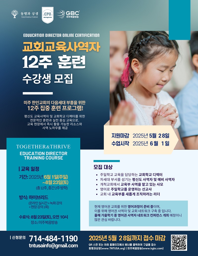 가정과 교회의 모든 다음 세대 책임자들을 위해 현장 중심 커리큘럼과 전문 강사진으로 준비된 이번 훈련 과정의 등록 마감은 5월 28일까지이며, 첫 온라인 미팅은 6월 1일 저녁에 시작된다. 등록은 동행과 상생 홈페이지 tntusa.org 또는 미주복음방송 전화 714-484-1190을 통해 할 수 있다. 아이들 수가 10명 미만인 작은 교회나 선교사에게는 50%에서 100%까지 장학 혜택이 제공된다. 강정자 교수는 이 훈련 과정이 귀한 기회임을 다시 한번 강조하며, 다음 세대 사역에 뜻이 있는 많은 부모와 교회 리더십의 참여를 부탁했다.