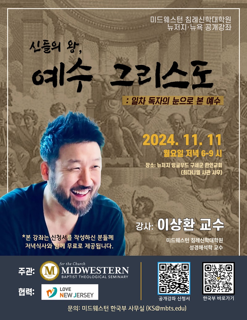 교회를 위하여란 기치로 지역 교회를 섬기는 미드웨스턴 한국부는, 미드웨스턴의 성경해석학 교수이자 제2성전기 문헌의 권위자인 이상환 교수를 강사로, “신들의 왕, 예수 그리스도: 일차 독자의 눈으로 본 예수라는 주제의 공개강좌를 개최한다.