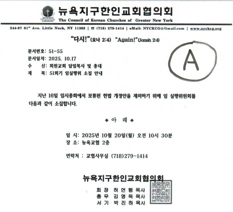 8. 또 다시 뉴욕교협에 묻습니다.11월 6일(목)에 뉴욕교협 정기총회가 예정되어 있는데, 정기총회를 이틀 앞두고, 속개할 수 없는 ‘임시총회’를 속개하겠다고, 날짜도 틀리고, 대상도 틀리고, 제목도 틀린, 어디 가서 뉴욕교협에 속한 회원교회의 목사라고 말을 하기에도 창피스러울 정도의 공문을 보내며, 굳이 또 다른 위법을 자행하려는 이유가 무엇입니까?