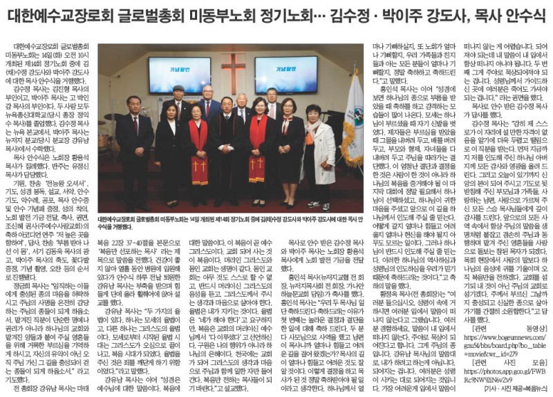대한예수교장로회 글로벌총회 미동부노회 정기노회 --- 김수정, 박이주 강도사 목사 안수식 작성자 정보 복음뉴스 작성 작성일 2025.10.17 05:24 컨텐츠 정보 목록 본문 복음뉴스 제공 2025년 10월 17일(금) 자 뉴욕일보 A4면 기사 SNS 공유 관련자료 댓글 0 등록된 댓글이 없습니다. 로그인한 회원만 댓글 등록이 가능합니다. 목록