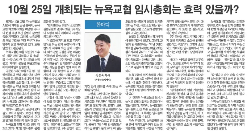한마디 - 10월 25일 개최되는 뉴욕교협 임시총회는 효력 있을까?
