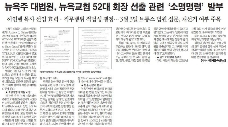 뉴욕주 대법원, 뉴욕교협 52대 회장 선출 관련 '소명명령' 발부 작성자 정보 복음뉴스 작성 작성일 2026.02.25 06:39 컨텐츠 정보 목록 본문 복음뉴스 제공 2026년 2월 25일(수) 자 뉴욕일보 A3면 기사 SNS 공유 관련자료 댓글 0 등록된 댓글이 없습니다. 로그인한 회원만 댓글 등록이 가능합니다. 목록