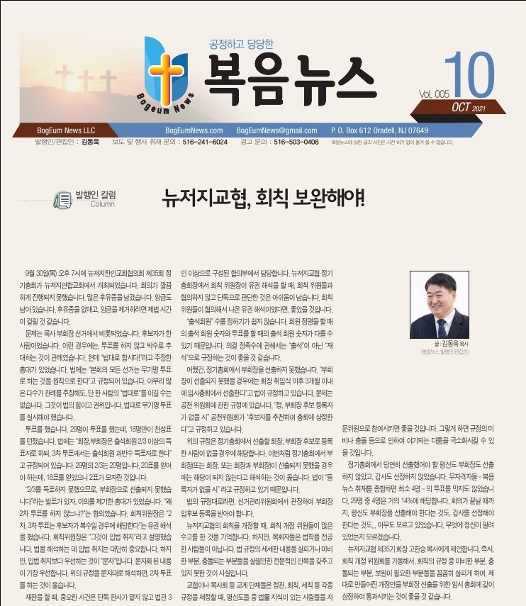 김동욱 목사의 발행인 칼럼 "뉴저지교협, 회칙 보완해야!", 뉴욕교협 서기 박시훈 목사의 "2021년 할렐루야 대뉴욕 복음화대회를 마치고", 조원태 목사의 "포스트 코로나 교회가는 길의 전망 4", 한삼현 목사의 "하나님의 말씀(성경)을 마주할 때 - '글자를 넘어서 성령으로 말미암아'", 문갈렙 선교사의 Mission Fileld 단상 5번 째 글 "가라, 행하라!", 유재도 선교사의 말씀과 선교 5번 째 글 "담대하라", 김혜영 목사가 만나는 일상 5번 째 글 "오늘의 에덴에 살고 싶다", 오종민 목사의 살며 생각하며 5번 째 글 "희망을 주는 말 한 마디", 조희창 목사의 "사랑하기에 아름다운 이야기" 5번 째 글 "론 할아버지가 들려주신 이야기", 권캐더린 목사의 "사랑한다...", 이종식 목사의 목회 이야기 5번 째 글 "목사가 이 땅에서 주님의 몸 된 교회를 성장시키려면 무엇에 가장 힘을 써야 할까?", 김현기 목사의 나의 인생 나의 노래 5번 째 글 "하나님과 동행하는 작곡가, 김유신 집사", 강유남 목사가 정리한 "예수님이 전한 천국 복음" 5번 째 글 "천국 복음", 한준희 목사의 성도들과 함께 생각할 신앙 칼럼 5번 째 글 "주일 성수", 양춘길 목사의 영혼의 산책 이야기 5번 째 글 "나부터 시작", 이윤석 목사의 요한복음 살펴보기 5번 째 글 "율법은 하나님을 알려준다(3)", 김용복 목사의 "거지 옆자리", 한순규 목사의 "러브 뉴저지 힐링 캠프를 다녀와서", 배성현 목사의 시 "십자가 - 죽음보다 강한 사랑", 양희선 장로의 시 "때때로 종종 그리고 은혜" 등이 실려 있다.