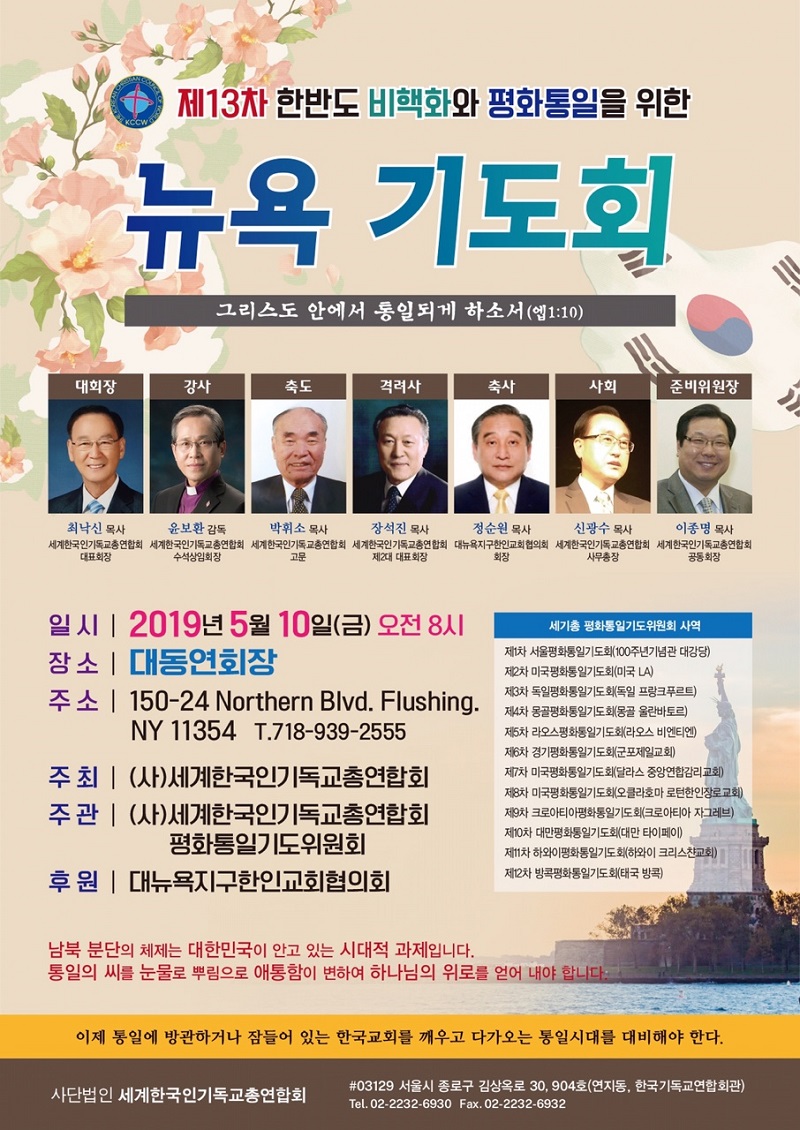세계한국인기독교총연합회(대표회장 최낙신 목사, 이하 세기총)는 "제13차 한반도 비핵화와 평화통일을 위한 뉴욕 기도회"를 5월 10일(금) 오전 8시에 플러싱에 있는 대동연회장에서 개최한다.