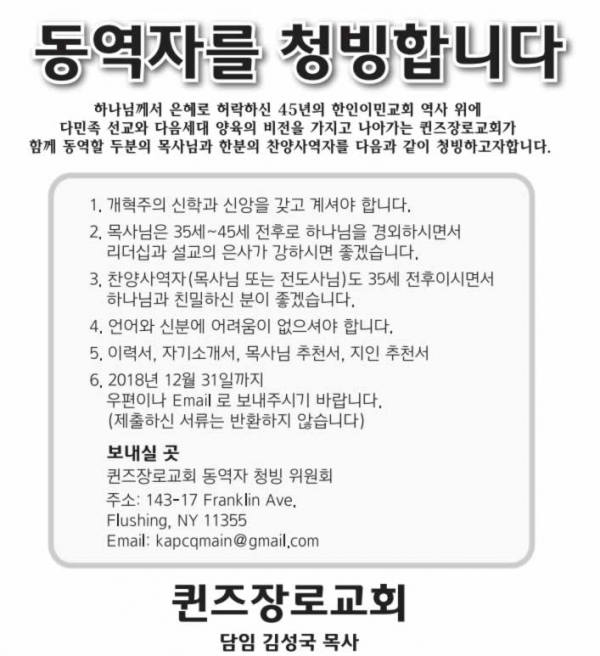퀸장에서 2분의 부목사님과 1분의 찬양사역자 청빙