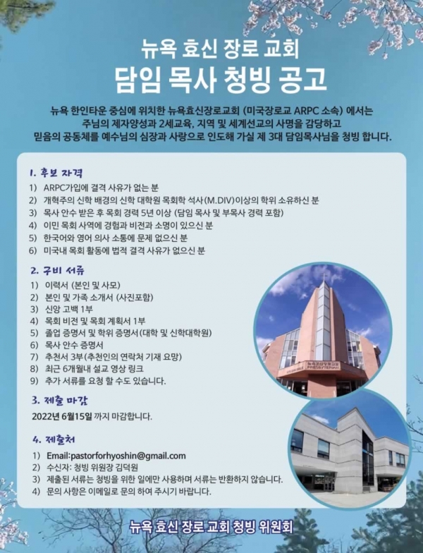 뉴욕효신장로교회 담임목사 청빙 공고
