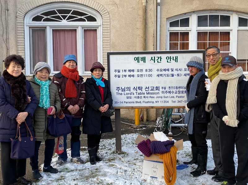 뉴욕모자이크교회(담임 장동일 목사) 여선교회 소속 권사들은 12월 3일(화) 오전 주님의식탁선교회(대표 이종선 목사)를 방문하여 털목도리와 모자를 전달했다.