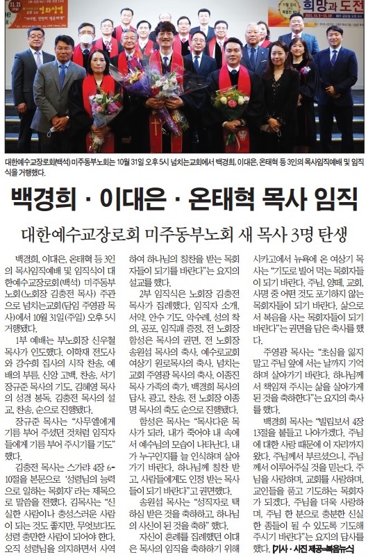 복음뉴스 제공 2021년 11월 4일(목) 자 뉴욕일보 A2면 기사