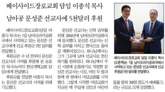 베이사이드장로교회 담임 이종식 목사 남아공 문성준 선교사에 5천달러 후원