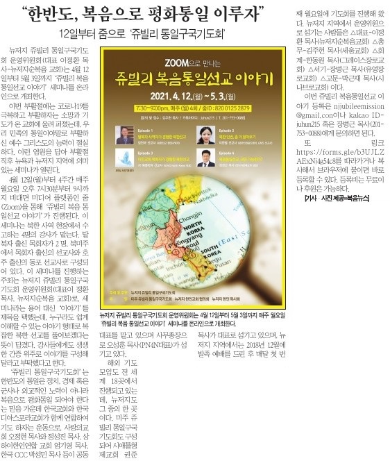 복음뉴스 제공 2021년 4월 10일(토) 자 뉴욕일보 A3면 기사
