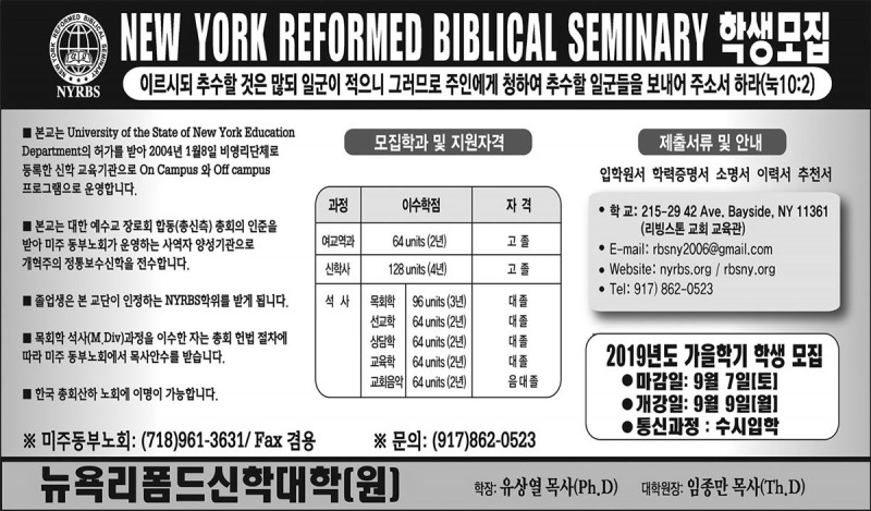 뉴욕리폼드신학대학(원) 2019년도 가을학기 학생 모집