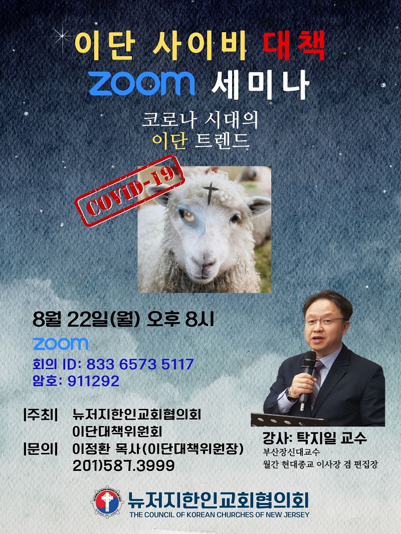 팬데믹시대에 교회가 새로운 전도방법을 모색하듯이, 이단들도 새로운 방법으로 전도전략을 세우고 교회와 많은 영혼들을 어지럽게 하고 있습니다. 이러한 가슴 아픈 현실을 극복하고 방어하는 차원에서 뉴저지 교협에서는 온라인 이단, 사이비 세미나를 하고자 합니다. 이번 세미나를 교회차원에서 교우들에게 홍보해 주시고 적극 동참하셔서 교회를 건강하게 지키는데 마음을 모았으면 합니다.