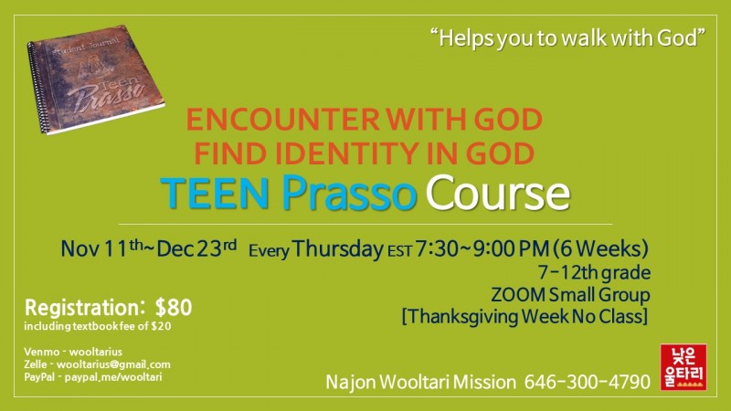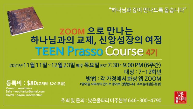낮은울타리 미주본부(대표간사 : 조희창 목사)에서 뜨거운 반응가운데 진행되어온 Teenager 자녀들을 위한 <Zoom으로 만나는 Teen Prasso Course>4기를 개강합니다.