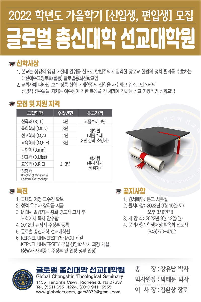 글로벌총신대학 선교대학원 2022학년도 가을학기 신입생, 편입생 모집 안내