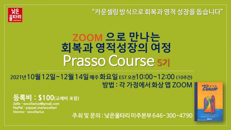 낮은울타리 미주본부(대표 : 조희창 목사)에서 Zoom으로 만나는 회복과 영적성장의 여정 <Prasso Course> 과정을 엽니다.