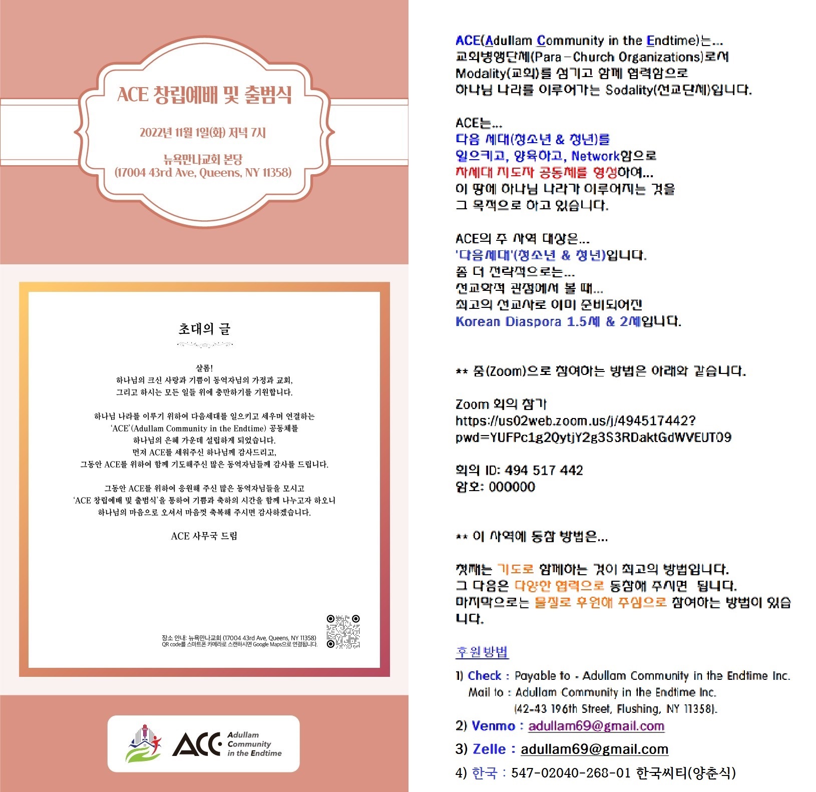 하나님 나라를 위하여 다음세대를 세우고자 2022년 11월 1일(화) 저녁 7시, 뉴욕만나교회 본당에서 ‘ACE 창립예배 및 출범식’을 시작합니다. 하나님의 마음으로 오셔서 마음껏 축복해 주시면 감사하겠습니다.