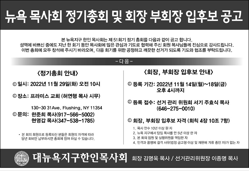 뉴욕목사회 정기총회 및 회장 부회장 입후보 공고
