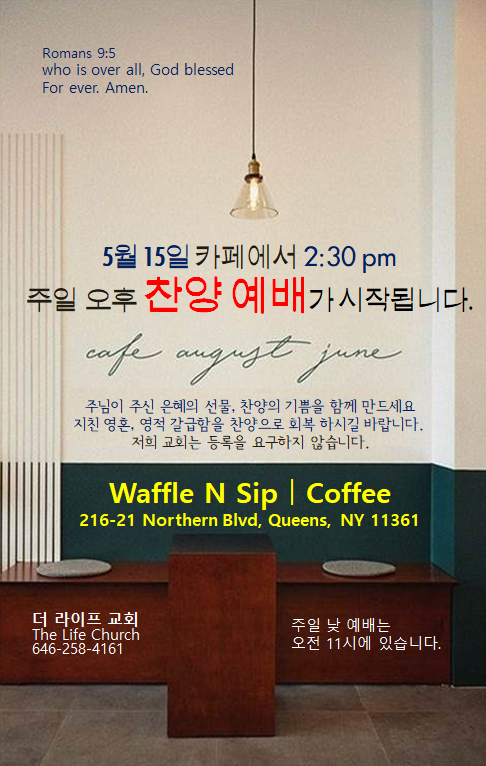 노던 216가 "와플앤십 카페"에서 5월 15일 주일 오후 2:30분에 찬양예배를 드리게 됩니다.