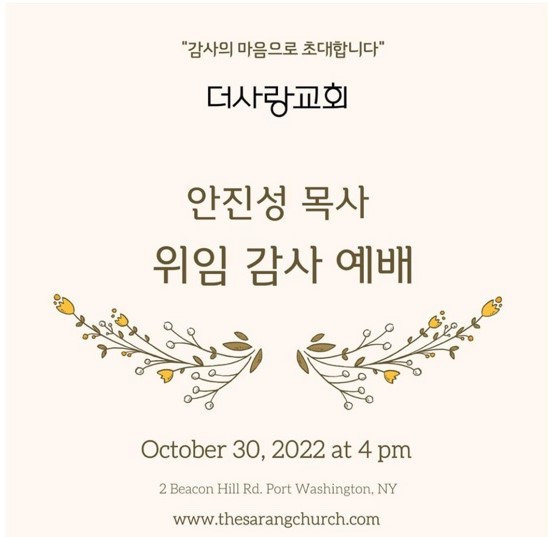 더사랑교회(전 뉴욕빌라델비아장로교회)가 41주년을 맞이하여 3대 담임 안진성 목사의 위임 감사 예배를 드립니다.많이 참석하셔서 함께 축하해 주시기 바랍니다.일시 : 10월 30일(주일) 오후 4시장소 : 더사랑교회(전 뉴욕빌라델비아장로교회) 2 Beacon Hill Rd., Port Washington, NY 11050