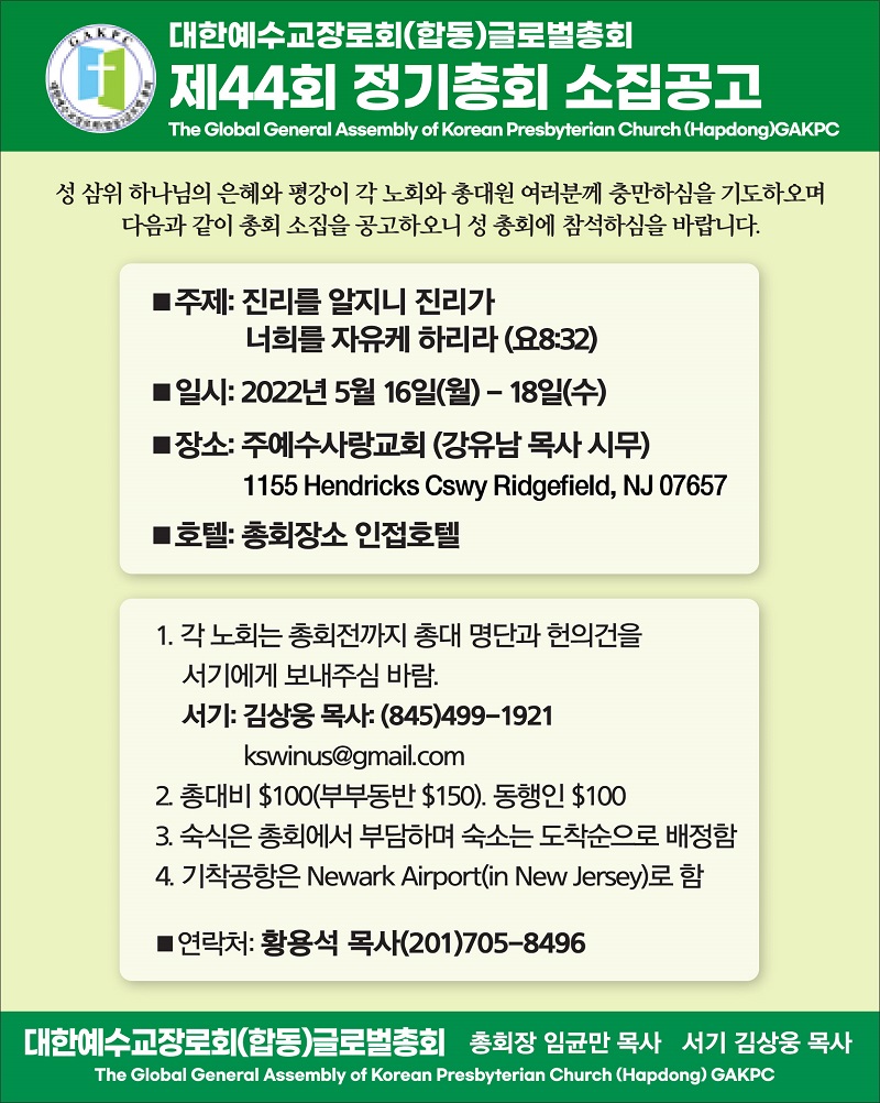 대한예수교장로회(합동)글로벌총회 제44회 정기총회 공고