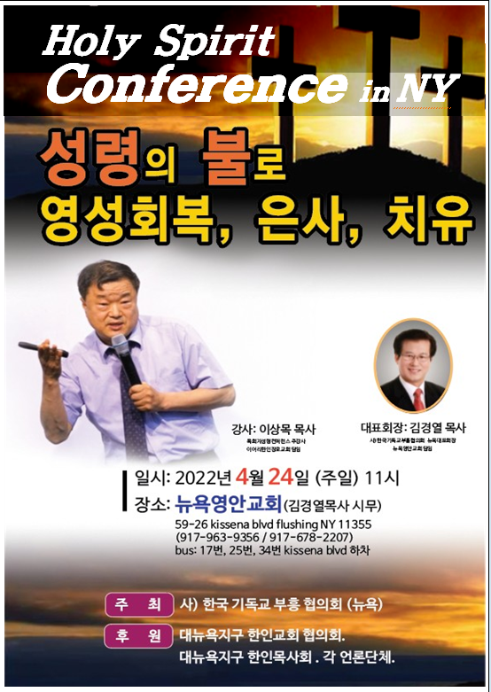 2022년 뉴욕 복음과 성령집회 강사: 이상목 목사 2022년 4월 24일, 뉴욕영안교회에서 주일 11시. ”(욜2:28-32) - 28 그 후에 내가 내 신을 만민에게 부어 주리니 너희 자녀들이 장래 일을 말할 것이며 너희 늙은이는 꿈을 꾸며 너희 젊은이는 이상을 볼 것이며 29 그때에 내가 또 내 신으로 남종과 여종에게 부어 줄 것이며 30 내가 이적을 하늘과 땅에 베풀리니 곧 피와 불과 연기 기둥이라 31 여호와의 크고 두려운 날이 이르기 전에 해가 어두워지고 달이 핏빛같이 변하려니와 32 누구든지 여호와의 이름을 부르는 자는 구원을 얻으리니 이는 나 여호와의 말대로 시온 산과 예루살렘에서 피할 자가 있을 것임이요 남은 자 중에 나 여호와의 부름을 받을 자가 있을 것임이니라