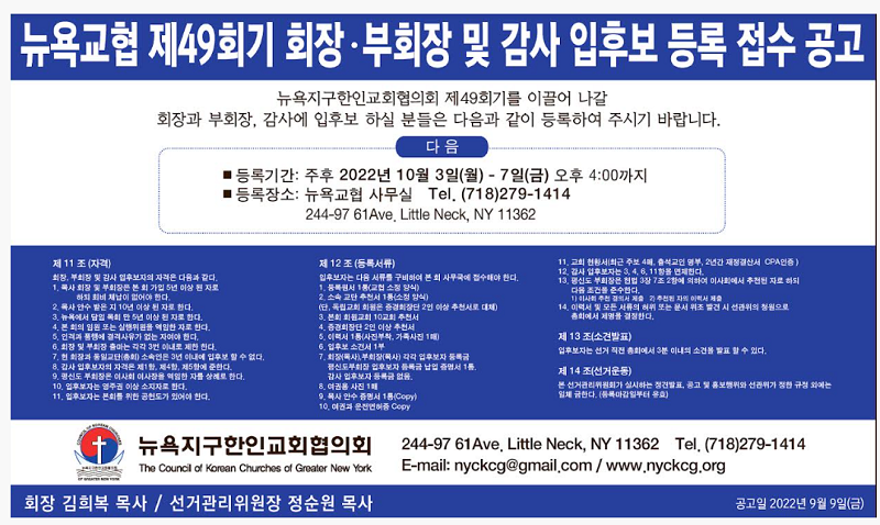 뉴욕교협 제49회기 회장, 부회장 및 감사 입후보 등록 접수 공고