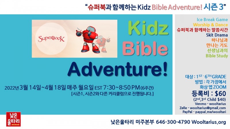 키즈 바이블 어드벤쳐 시즌3(시즌1, 시즌2와 다른 6개의 커리큘럼으로 진행됩니다)는 2022년 3월 14일 부터 4월 18일까지 매주 월요일 미주동부시간 7:30~8:50 PM 6주간 진행됩니다.