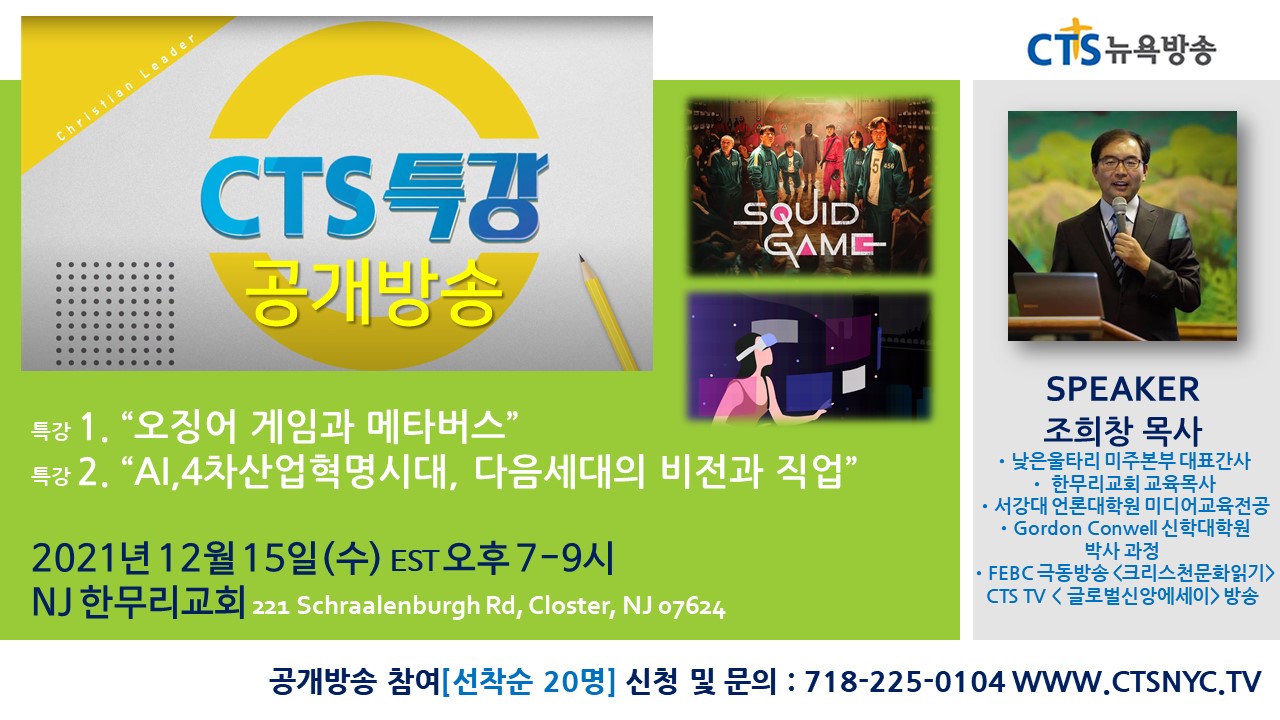 CTS 특강 공개방송(녹화)이 12월 15일(수) EST 오후 7-9시, 뉴저지 한무리교회(221 Schraalenburgh Rd, Closter, NJ 07624)에서 열립니다.