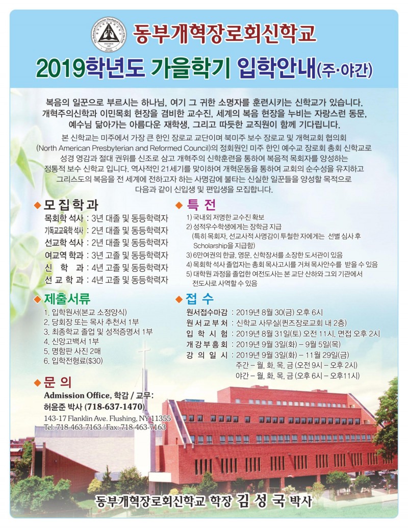 동부개혁장로회신학교 2019학년도 가을학기 입학 안내(주, 야간)