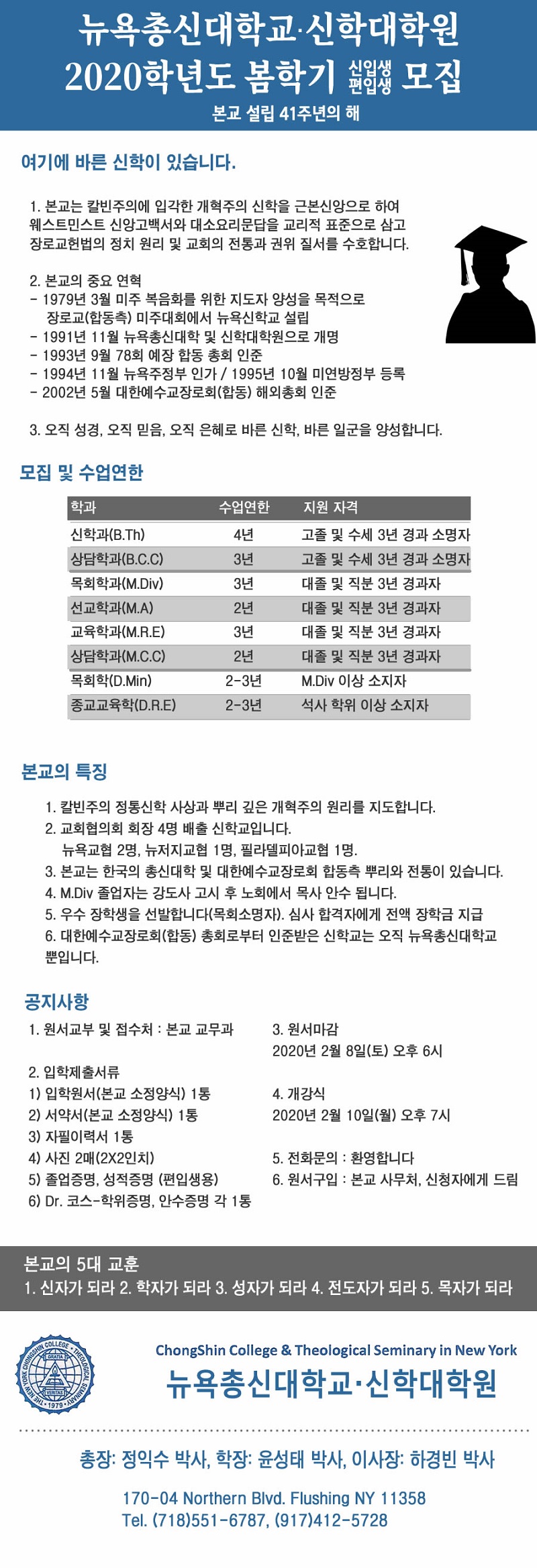 뉴욕총신대학교,신학대학원 2020학년도 봄학기 신입생 및 편입생 모집