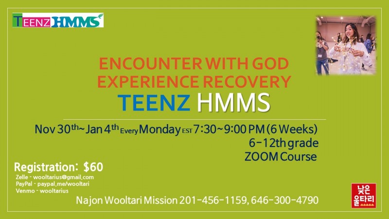 낮은울타리 미주본부(대표간사 : 조희창 목사)에서 이번 연말 N세대 자녀들을 위한 <자녀회복학교 TEENZ HMMS>를 영어과정으로 열게 되었습니다.