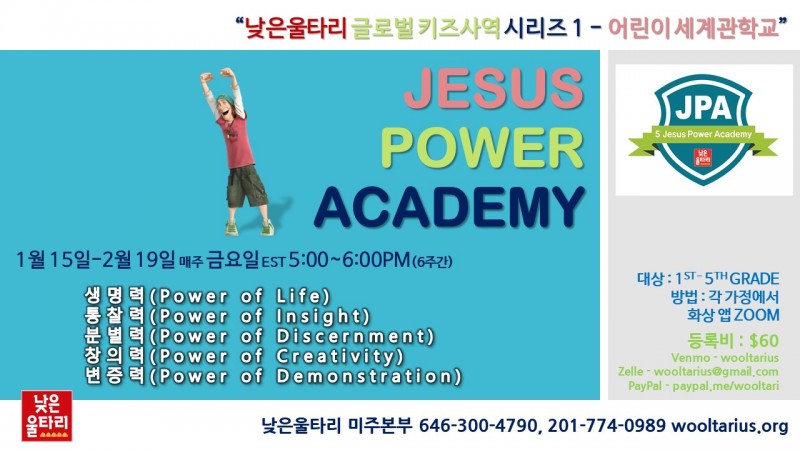샬롬! 낮은울타리 미주본부(대표간사 : 조희창 목사)에서 ZOOM으로 만나는 어린이 세계관 학교 <JESUS POWER ACADEMY>를 엽니다.