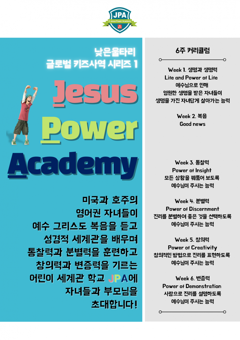 Jesus Power Academy는 자녀들이 예수그리스도의 복음을 듣고 성경적 세계관을 배우며 통찰력과 분별력을 훈련하고 창의력과 변증력을 기르는 학교입니다.