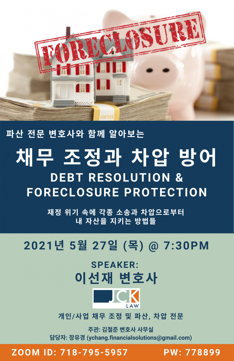 제목 : 채무 조정과 차압 방어 ZOOM 무료 세미나 (이재선 변호사 NY)