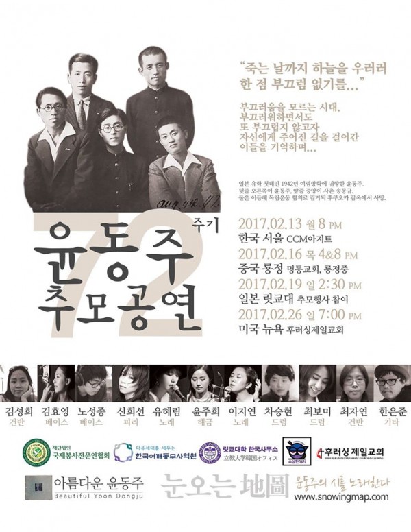 어김없이 2월이면 찾아오는 연례기획. 금년 윤동주 72주기 추모공연은 중국의 한 대학에 계신 한인 교수님의 열심으로 윤동주 생가가 있는 룡정에서, 또 유시경 신부님의 도움으로 윤동주 시인이 다녔던 일본 릿쿄대의 추모행사에도 참여할 수 있게 되었고 어깨동무사역원의 윤은성 목사님과 홍대수상한거리의 백종범 목사님의 도움으로 한국 CCM 아지트에서, 미국 뉴욕의 후러싱제일교회 김정호 목사님의 초청으로 뉴욕 후러싱제일교회에서, 또 뉴저지의 원호길 신부님의 초청으로 뉴저지한인성공회에서 추모공연을 가질 수 있게 되었습니다. 미국 각 지역과 한국으로 뿔뿔히 흩어진 "눈오는 지도인"들의 눈물겨운 참여로 가능하게 되었습니다. 다들 감사드리며 많은 분들이 함께 기억하고 추모할 수 있기를 소망합니다.