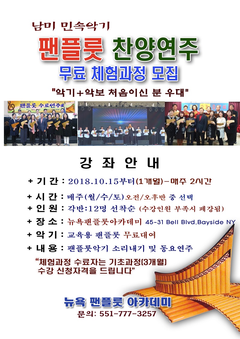 - 장소: 뉴욕 팬플룻 아카데미 (45-31 Bell Blvd. Bayside, NY)