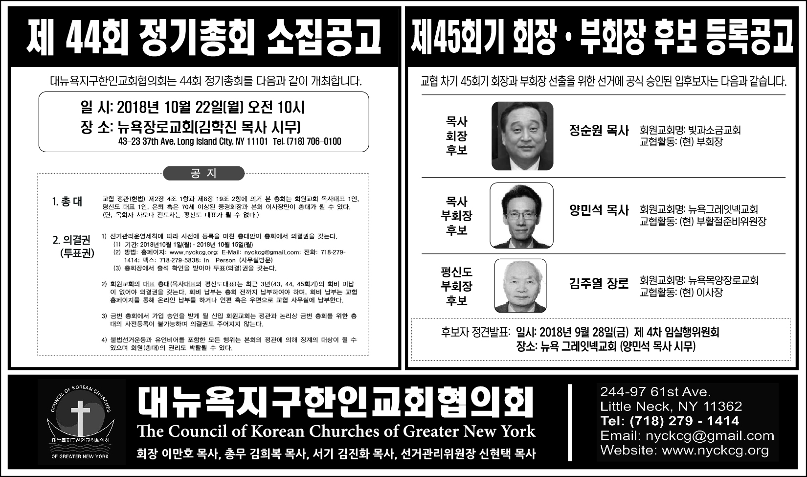 일시 : 10월 22일(월) 오전 10시 장소 : 뉴욕장로교회(김학진 목사) 43-23 37th Ave, Long Island City, NY 11101
