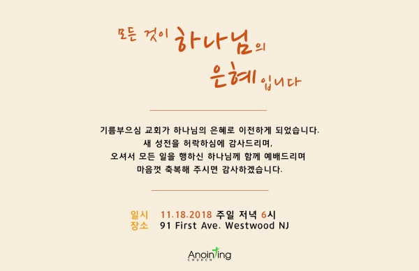할렐루야! 주님의 이름으로 문안드립니다. 하나님의 은혜로 저희 기름부으심 교회가 새 성전 입당 감사예배를 드리게 되었습니다. 바쁘시겠지만 참석해 주셔서 함께 축복해 주시면 감사하겠습니다. 일시: 11월 18일 주일 저녁 6시 장소: 91. First Ave. Westwood, NJ