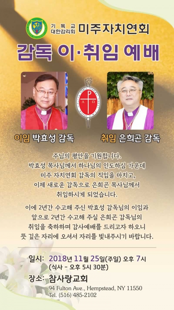 기독교대한감리회 미주자치연회 감독 이.취임식 이임: 박효성 감독, 취임: 은희곤 감독 * 일시: 2018년 11월 25일(주일) 오후 5:30(식사), 오후 7:00(예배) * 장소: 참사랑교회 (94 Fulton Ave, Hempstead. NY 11550), 516) 485-2102